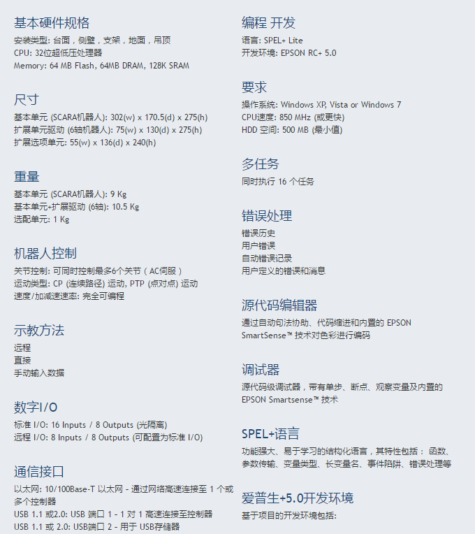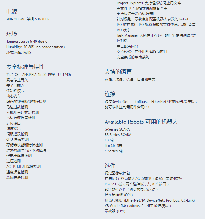 控制愛普生G系列和RS系列及S系列6軸機(jī)器人;完全集成選項(xiàng)包括:圖像處理、網(wǎng)絡(luò)連接性、以太網(wǎng)/IP和更多選項(xiàng)